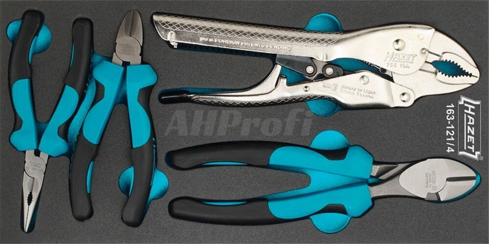 Sada kleští v pěnové vložce HAZET, vhodná do zásuvek dílenských vozíků, obsahuje 4 kusy - 2 x štípací, dlouhé ploché a samosvorné kleště.