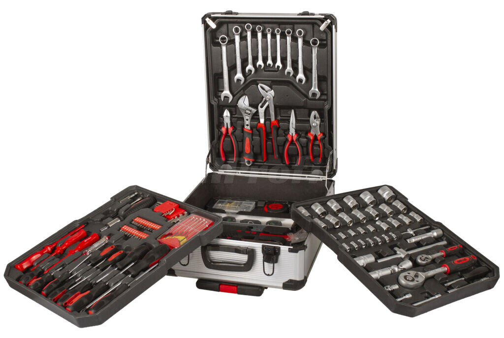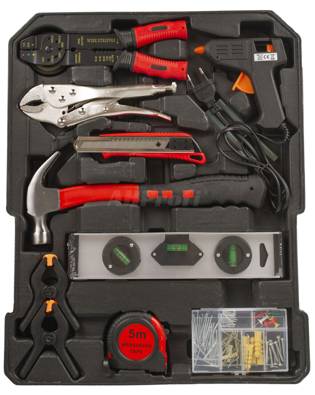 - Sada obsahuje: celou řadu kleští, šroubováků, gola klíčů, kladivo, vodováhu, stranové i imbus klíče, bity, základní spojovací materiál a další nářadí, které je vhodné pro použití jak doma, v garáži, tak i na cestách.