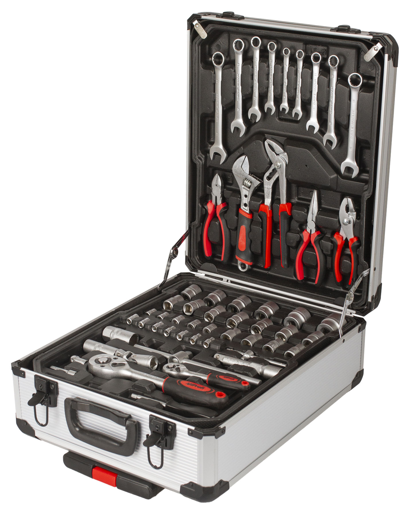 Praktický hliníkový kufr se 186 díly kvalitního ručního nářadí. Prvky z kovu jsou z Cr-V v matném provedení. Madla a rukojeti tvořená kombinací gumy a plastu velmi dobře padnou do ruky a zaručují pohodlný úchop. Výbava je vhodná do každé dílny a domácnosti.