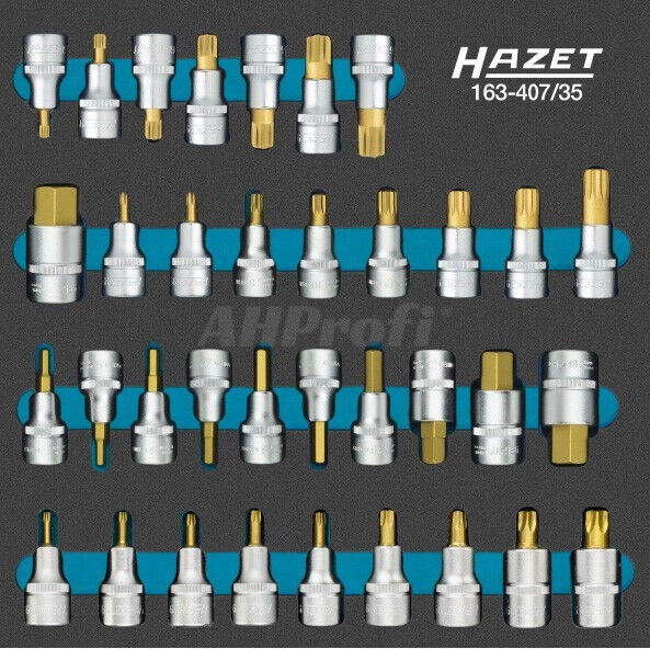 Kvalitní sada nástrčných hlavic 1/2" s bity IMBUS, TORX, XZN a RIBE CV, německý výrobce HAZET, dodáváno v pěnové vložce, ideální do pojízdných vozíků.