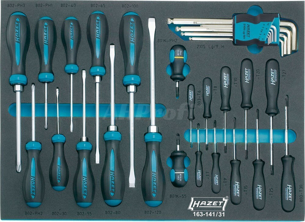 Sada kvalitních německých šroubováků HAZET, 31 kusů v pěnové vložce, ideální do zásuvek dílenských vozíků, obsahuje ploché, křížové, šestihranné i TORX šroubováky.