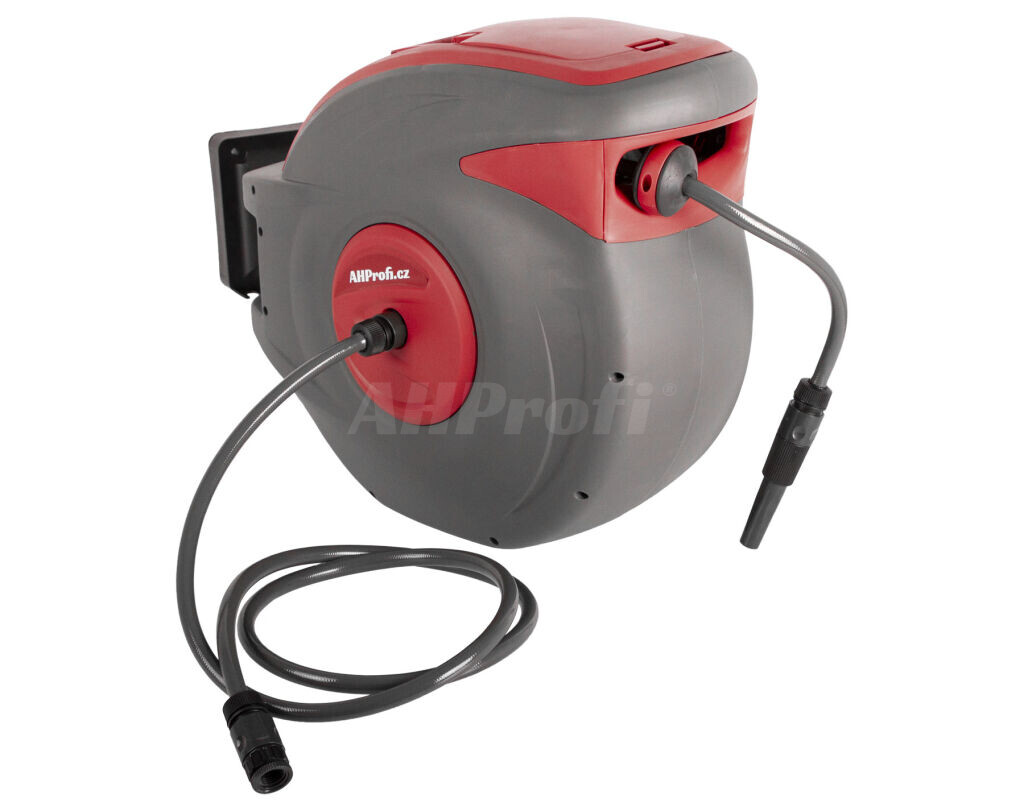 Samonavíjecí buben z odolného plastu s 30 metrovou vysokotlakou hadicí pro vodu, hadice ukončena rychlospojkou, max. tlak 10 bar.