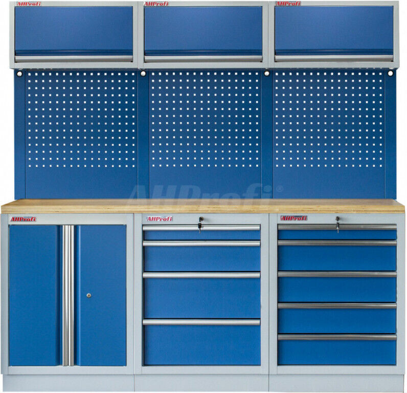 Sestava 14 ks, 2040 x 495 x 2000 mm, dřevěná pracovní deska, modulární, celokovová, modrá. Horní skříňky: 3 výklopné. Spodní skříňky: dvoukřídlá / 4 a 5 šuplíková. 3 děrované desky s roztečí 38 x 38 mm. Kvalitní dílenský nábytek vhodný pro profesionální servisy i domácí garáže a dílny.