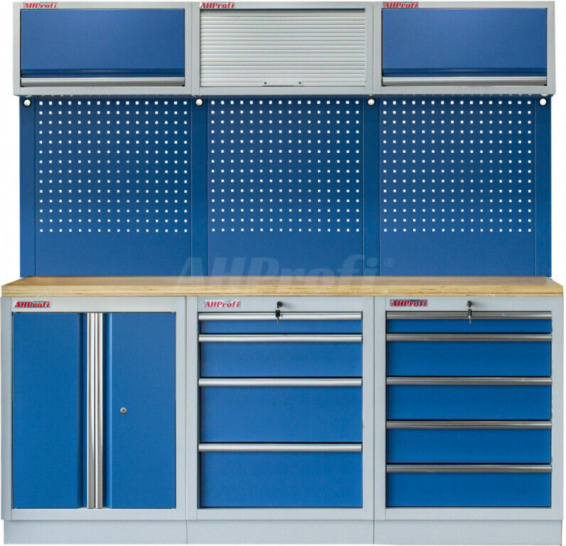 Sestava 14 ks, 2040 x 495 x 2000 mm, dřevěná pracovní deska, modulární, celokovová, modrá. Horní skříňky: 2 s roletou, 1 výklopná. Spodní skříňky: dvoukřídlá / 4 a 5 šuplíková. 3 děrované desky s roztečí 38 x 38 mm. Kvalitní dílenský nábytek vhodný pro profesionální servisy i domácí garáže a dílny.