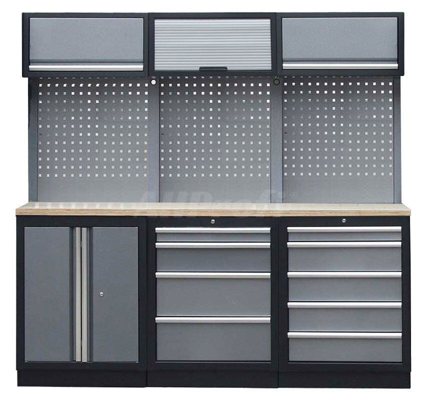 Sestava 14 ks, 2040 x 495 x 2000 mm, dřevěná pracovní deska, modulární, celokovová, šedá. Horní skříňky: 2 výklopné, 1 s roletou. Spodní skříňky: dvoukřídlá / 4 a 5 šuplíková. 3 děrované desky s roztečí 38 x 38 mm. Kvalitní dílenský nábytek vhodný pro profesionální servisy i domácí garáže a dílny.