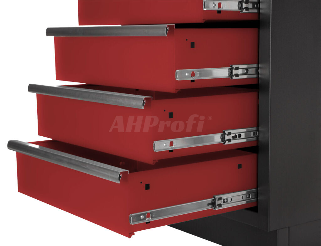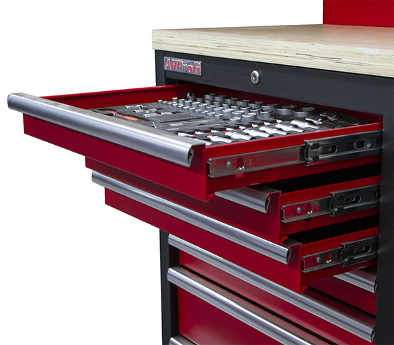 Zásuvky dílenského nábytku PROFI mají vysoce kvalitní pojezdy s kuličkovými ložisky, které poskytují plynulost a přesnost pojezdu zásuvek i při plném zatížení. Max. nosnost zásuvky činí 30 kg.