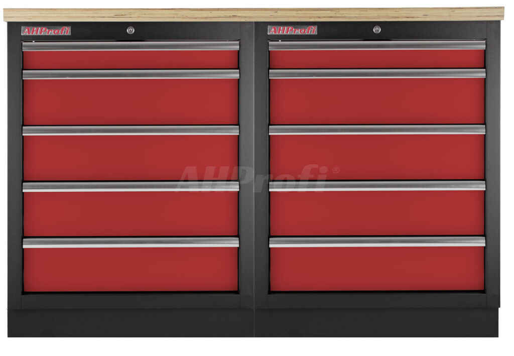 Sestava 3 ks, 1360 x 465 x 910 mm, dřevěná pracovní deska, modulární, celokovová, červená. Spodní skříňky: 2x 5 šuplíková. Kvalitní dílenský nábytek vhodný pro profesionální servisy i domácí garáže a dílny.