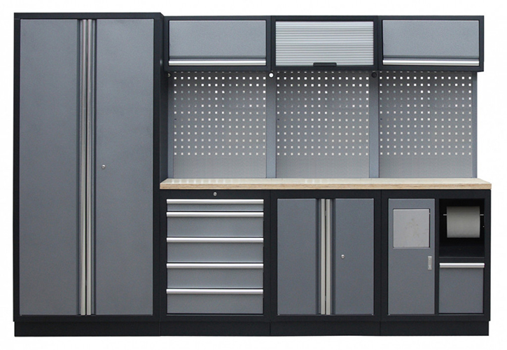 Sestava 15 ks, 2955 x 495 x 2000 mm, dřevěná pracovní deska, modulární, celokovová, šedá. Horní skříňky: 2 výklopné, 1 s roletou. Spodní skříňky: dvoukřídlá / s košem / 5 šuplíková. Vysoké skříně: široká. 3 děrované desky s roztečí 38 x 38 mm. Kvalitní dílenský nábytek vhodný pro profesionální servisy i domácí garáže a dílny.