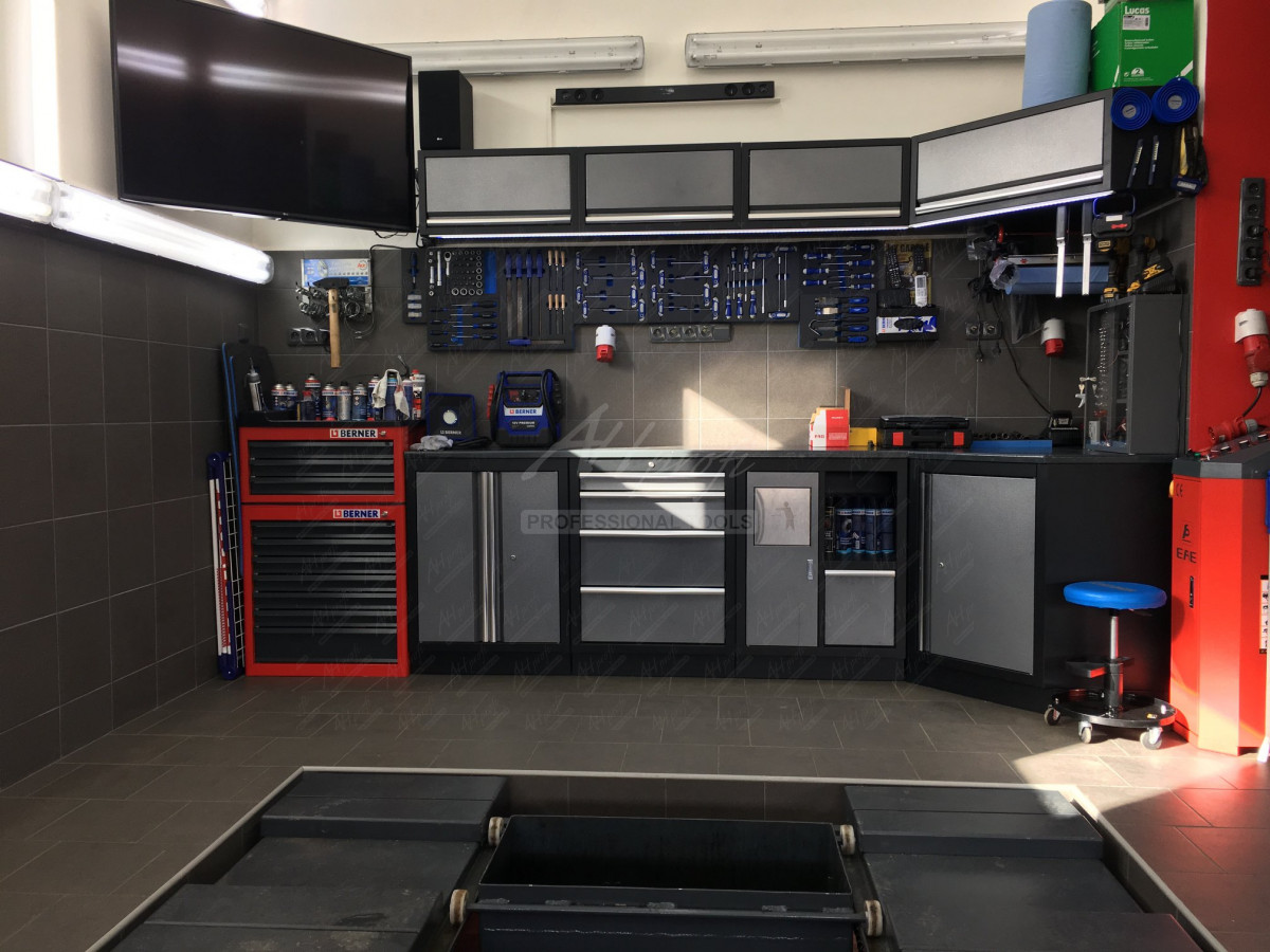 Pracovní stůl by měl být vždy čistý pro práci. Žádné klíče, šrouby, kleště, rukavice a další nářadí poházené po stole. K tomu Vám můžou dopomoci organizéry, děrované desky s háčky nebo magnetické desky. Děrovaná deska již disponuje příslušenstvím, které zajistí organizaci drobného nářadí zavěšeného na stěně. Nejenže se jedná na oko hezké uspořádání, ale i velmi praktické. Velmi užitečným pak je pracovní stůl, který má k sobě již umístěnou děrovanou desku a lze pak pouze dokupovat háčky podle potřeby. Pro náročnější pak je možnost pořídit si dílenský nábytek, který lze sestavit na míru. Jednu takovou si pořídil náš zákazník, který nám zaslal poděkování s fotografií, jak momentálně vypadá jeho dílna. V případě zájmu o dílenský nábytek sestaven na míru, nabízíme na vyžádání i možnost, že specialista AHProfi přijede do Vaší garáže a sestavu vám složí. Jednak si zakládáme na spokojeném zákazníkovi, tak ale i na osobním přístupu.