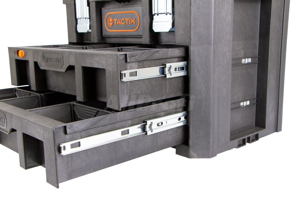 Produkty od této značky se vyznačují kvalitou zpracování a odolností materiálů. U produktů od značky Tactix najdete ideální rozměry na organizaci drobného spojovacího materiálu. Zajímavostí jsou například vodotěsné kufry na nářadí, o jejichž vodotěsnosti se můžete přesvědčit ve videu. Organizace nářadí v dílně nebo garáži půjde se značkou Tactix opravdu snadno.